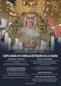 La Hermandad de la Sed ha dado a conocer el que será su calendario de actos y cultos en honor a su titular mariana, la Virgen de Consolación Madre de la Iglesia, que como bien figura en sus reglas se celebrará en el presente mes de septiembre.