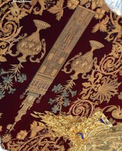 Hay que recordar que esta labrada pieza del bordado fue realizada por las Hermanas Martín Cruz en 1954, partiendo de un dibujo realizado por Fernando Villar y José Martínez. Este mismo taller de bordados fue el encargado de confeccionar la toca de sobremanto de salida de la Dolorosa en 1960.