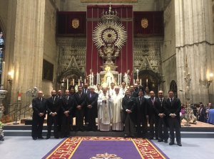 A las 11.36h de la mañana daba comienzo la Misa Estacional de Coronación con una homilía, emotiva y extensa, a cargo del señor arzobispo, don Juan José Asenjo Pelegrina. Pocos minutos después, cuatro niñas de Hogar Social de Belén, obra asistencial de la Hermandad de las Cigarreras, se aproximaban al altar de Jubileo portando sobre las andas de la Hermandad del Cerro la corona remozada de la Dolorosa.