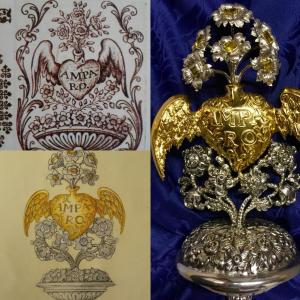 La pieza está realizada en plata, plata dorada y topacios, guardado el característico símbolo del corazón alado de la corporación. En cuanto al diseño, éste está inspirado en los antiguos grabados y convocatorias de la hermandad.