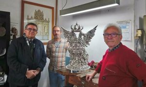 La otra águila se presentará en febrero, en la exposición de estrenos de la Semana Santa que acogerá el Círculo Mercantil e Industrial. Para su realización se han precisado 5’5 kilos de plata de ley, fundida con la donación de medallas, pulseras y otros objetos donados por hermanos y devotos de la corporación de San Vicente. Las dos nuevas piezas de orfebrería serán ubicadas en la parte trasera del canasto del paso del Nazareno, completando el conjunto las dos portentosas águilas delanteras que ejecutase el taller de Villarreal en los años setenta.