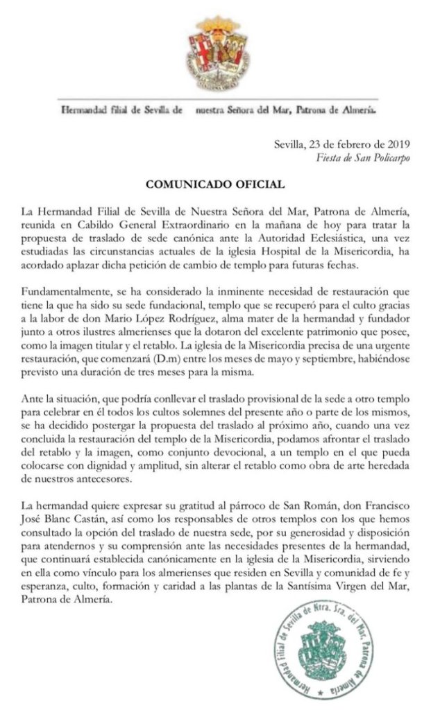 La Hermandad del Mar decidió, en el cabildo extraordinario del pasado 23 de febrero, permanecer en la iglesia de la Misericordia dadas las labores de restauración que se acometerán entre los meses de mayo y septiembre del presente curso. Ya que las obras conllevarían el cambio de sede provisional, se ha decidido esperar a que concluyan las mismas para tomar una decisión definitiva que determine cuál será el destino de la corporación letífica.