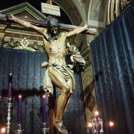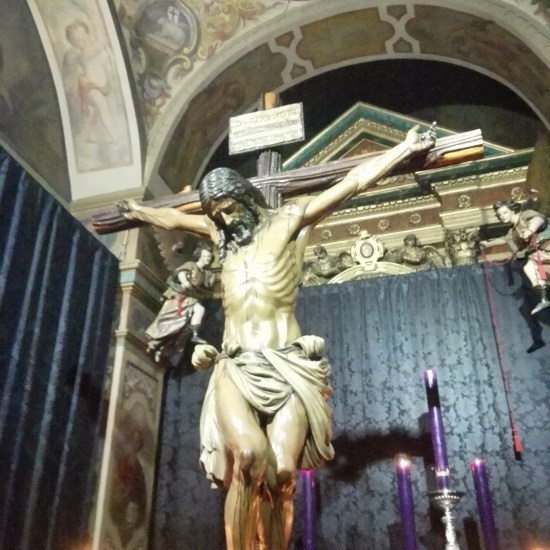 A pesar de la frialdad que desprende la iglesia conventual de San Buenaventura, la Hermandad de la Soledad ha sabido, una vez más, aportarle su propio sello al besapiés de su titular, el Santísimo Cristo de la Salvación. El morado pasionista fue protagonista tanto de las velas como del exorno floral del altar instalado en la capilla en la que, habitualmente, puede contemplarse a la Virgen de Guadalupe.