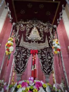 El Simpecado también presenta deformaciones en bordados, terciopelo y tela, especialmente en el forro, donde se aprecian pliegues verticales muy marcados. Las cabezas de marfil también están desgastadas, sucias y algo sueltas.