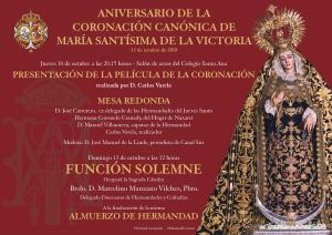 Se cumple el primer aniversario de la coronación canónica de María Santísima de la Victoria, titular de la Hermandad de las Cigarreras. Mañana miércoles 10 de octubre se presentará la película conmemorativa a esta efeméride con los momentos más significativos que vivió la corporación tanto en la preparación y los cultos como en la procesión de regreso. Se trata de una producción de Carlos Valera que será presentada en el salón de actos del colegio Santa Ana de los Remedios a las 20.15h.