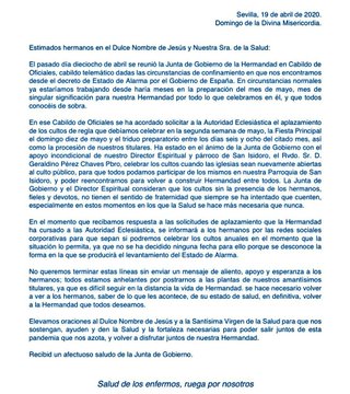 Hoy domingo, la corporación de la Costanilla emitía un comunicado a través del cual solicitaba a Palacio la posibilidad de aplazar su triduo, previsto del 6 al 8 de mayo, así como la salida procesional de la Virgen de la Salud, que iba a efectuarse el domingo 10 de mayo.