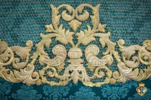 También se ha procedido al bordado parcial de las piezas que presentaban ausencias del bordado: cartulinas, hojillas, la malla que une las dos piezas frontales, lentejuelas… Para este menester se ha tenido que hacer uso de oro entrefino al ser el más adecuado al preexistente, y siempre respetándose el movimiento original de cada pieza.