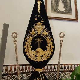 La Hermandad de Ánimas Benditas de Mairena del Alcor ha presentado su nuevo guión corporativo, bordado en oro fino sobre terciopelo negro por el taller de Bordados Soldán. Diseño de Mario Ramos, ha sido dirigido técnicamente por José María Soldán.