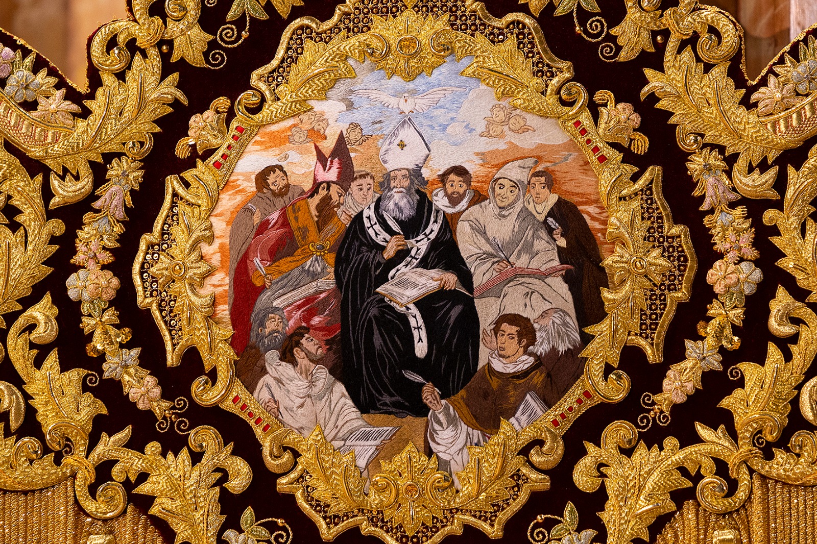 En el centro de su cara delantera aparece ricamente bordado y matizado en sedas la pintura del altar mayor de la antigua Iglesia de San Basilio de Sevilla, sede en la que se fundó la Hermandad en 1595. Dicha pintura, que representa a San Basilio dictando su doctrina (actualmente se encuentra en el Museo del Louvre de París), se debe a Francisco de Herrera “El viejo” (1638-1639) y formaba parte de los 18 cuadros que poseía este templo, de los cuales aún se conservan 8 en el Museo de Bellas Artes de Sevilla. La cara trasera, realizada en la misma técnica que la anterior, lleva bordado en cartulina de oro el lema “La Esperanza origina lo que en las almas piadosas siempre causa la alegría”, párrafo denominado la Paz Espiritual del libro ‘El Tesoro Espiritual de San Basilio el Grande’.