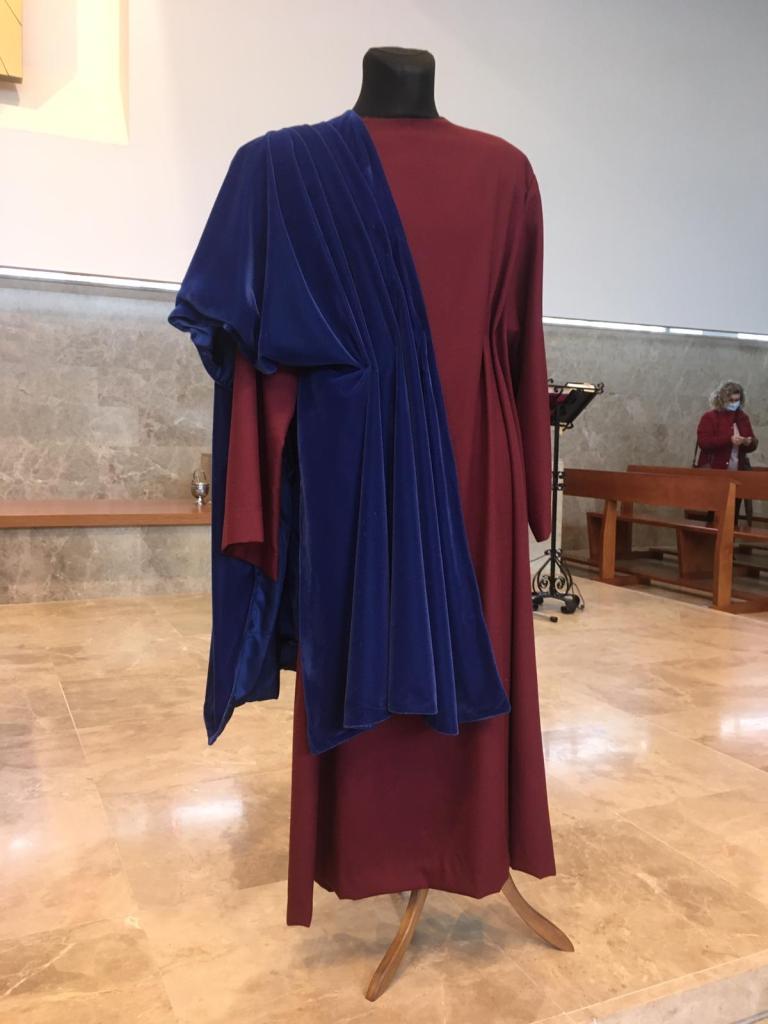 La túnica, de saga burdeos, ha sido realizada por Apolonio y el mantolín, a juego, por la modista María José Reyes García. Éste último es una donación del hermano de la corporación Francisco del Pino Sánchez.