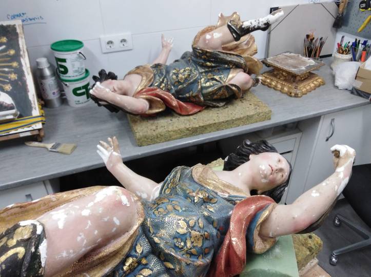 David Martínez Amores está siendo el encargado de la intervención, que se prolongará hasta marzo. Se está llevando a cabo un tratamiento integral de la restauración: limpieza, consolidación estructural, eliminación de repintes, estucado de lagunas y reintegración cromática.