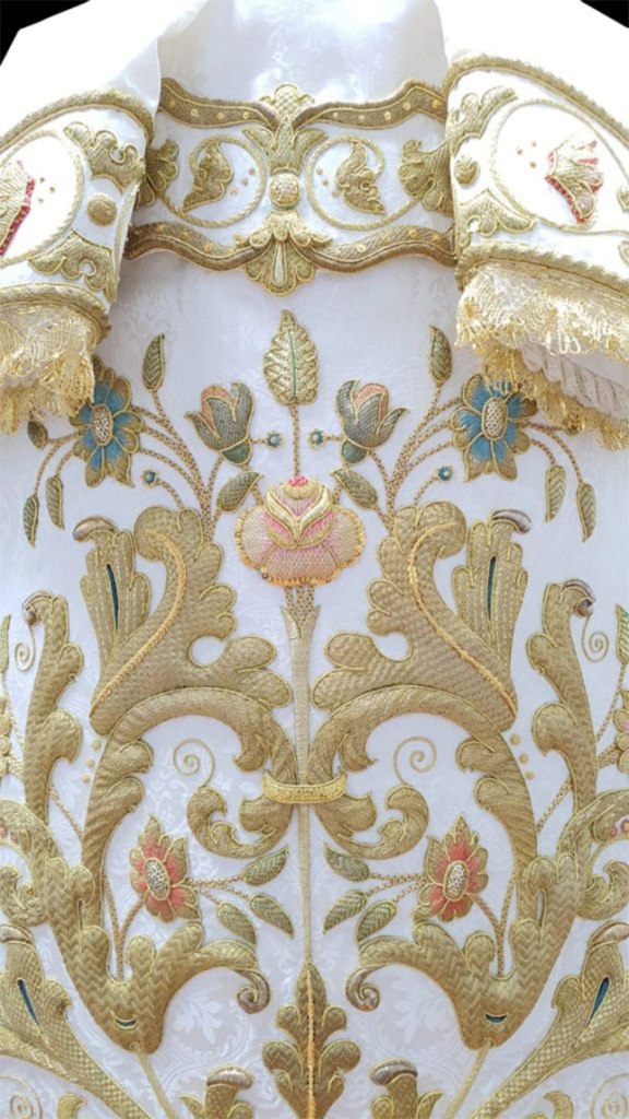 La intervención ha consistido en un pasado a nuevo soporte de damasco blanco de mayor calidad, desmontándose y limpiándose cada una de las piezas. El dibujo se ha enriquecido y las nuevas piezas se han bordado con técnicas como el cetillo, la hojilla, el jiraspe y el ladrillo.