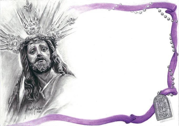 La obra, de la artista Elena Montero, nos muestra al Señor de la Corona justo a la izquierda, rodeando todo el lienzo una marco morado de la tonalidad de los antifaces de la corporación. Éste, a su vez, se entrelaza con un rosario que culmina en una medalla de la Virgen del Rosario, titular letífica de la Hermandad de la Corona.