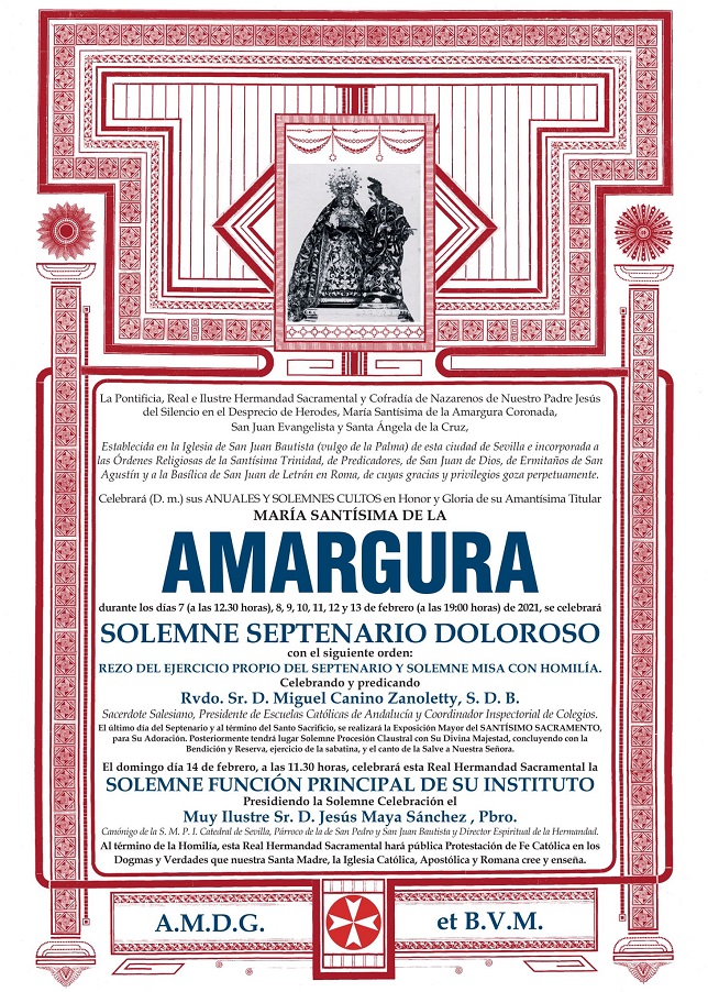 La Hermandad de la Amargura ha recuperado una orla antigua de cultos basada en una de 1917. Esta pieza se ha digitalizado y restaurado, sirviendo de modelo para la que anuncia el Septenario de la Santísima Virgen de la Amargura Coronada. Se trata de un estilo vanguardista.