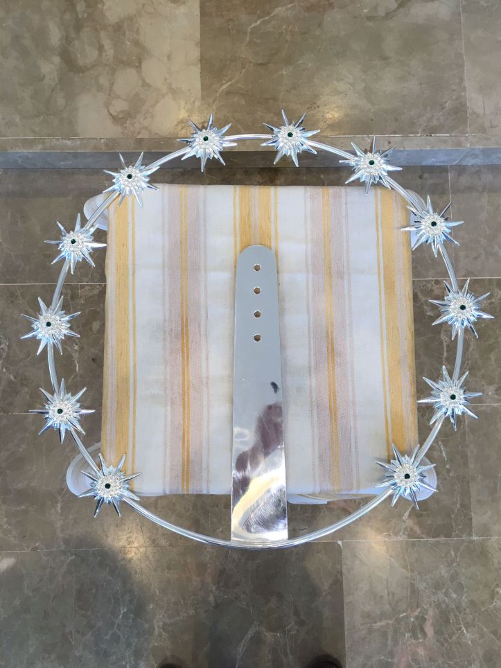 En otro orden, en cuanto al aro de estrellas de hebrea, es de 55 cm de metal bañado en plata, con estrellas repujadas a mano y desmontables para su limpieza. En el centro de la misma se puede observar piedrecitas verdes, color de su advocación, Esperanza. Realizado por Orfebrería Castilleja.