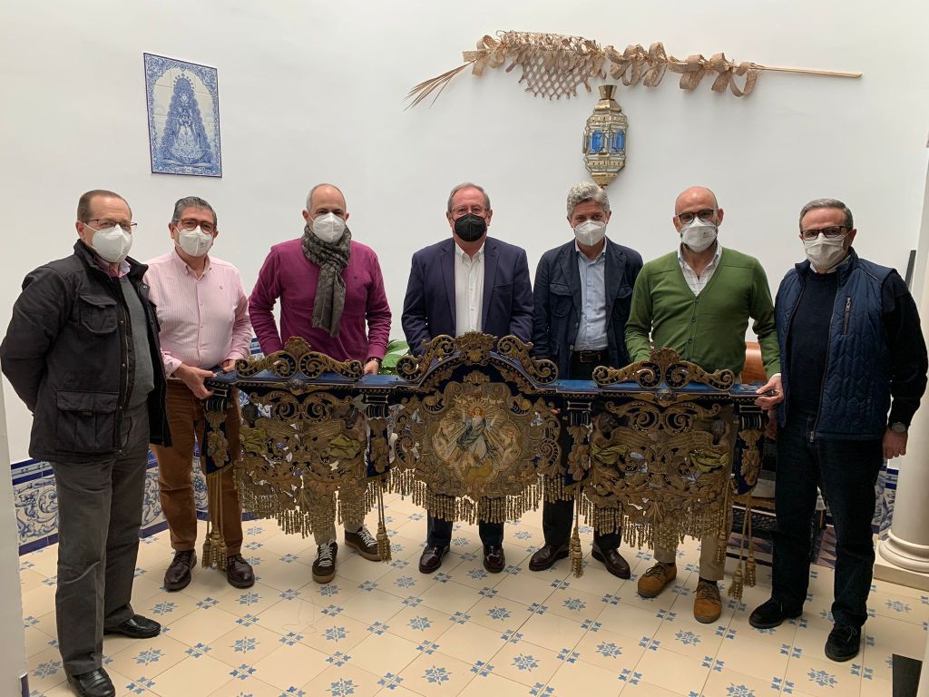 La Hermandad del Buen Fin firmó ayer en el taller de Artesanía de Bordado en Oro de Manuel Solano Rodríguez la restauración de las cuatro bambalinas del paso de palio de Nuestra Señora de la Palma Coronada. Esta intervención continúa la labor iniciada por la anterior junta de gobierno que comenzó por la magnífica intervención de conservación y consolidación realizada por el IAPH en el techo de palio.