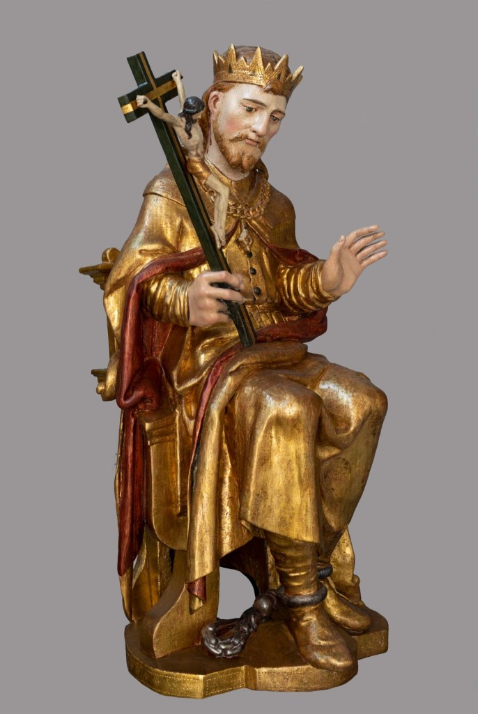 La imagen es expuesta en el Museo de Bellas Artes. Vemos al santo como rey, sedente en su trono y con corona, y como defensor del catolicismo y mártir, portando el hacha, los grilletes y el crucifijo. La talla, que se ha relacionado con el círculo de Juan Bautista Vázquez el Viejo,