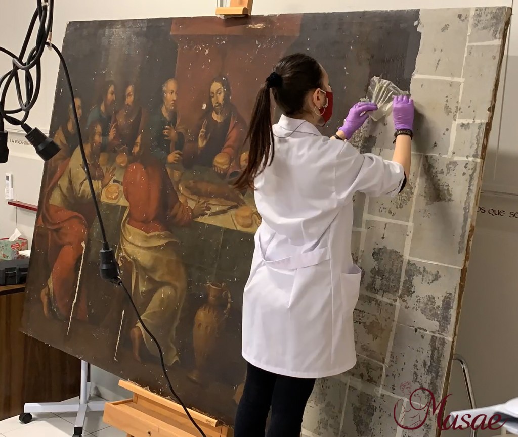 La empresa Musae Restauración de Arte viene trabajando en su taller en la restauración del óleo sobre lienzo «La Sagrada Cena» perteneciente a la Hermandad Sacramental de San Bernardo. En la intervención se han empleado técnicas para la consolidación del soporte textil y de los estratos que conforman la película pictórica, retirando antiguos parches y reentelando el conjunto para mejorar su conservación. También se ha procedido a la limpieza química del estrato de barniz superficial, eliminando numerosos repintes de la policromía original.