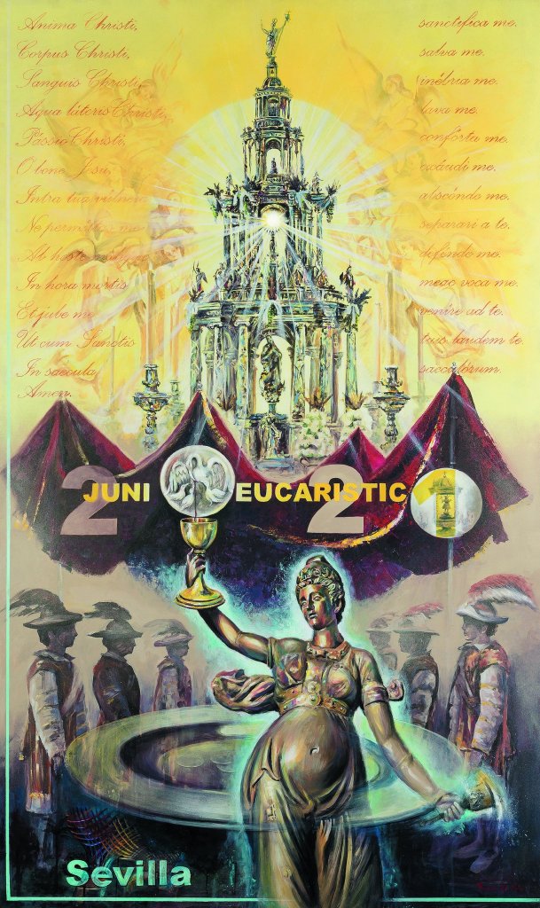 En la obra sobresalen la custodia de Arfe y el Giraldillo. Realizada en técnica mixta sobre tabla, utilizando acrílico, sanguina, pastel y grafito para su elaboración. Las dimensiones de la pintura son 150 x 90 centímetros. Los colores vaticanos (blanco y amarillento), contrastan con los rojizos y las tonalidades neutras, realzando la figura a contraluz. De igual modo, la composición sigue un esquema piramidal que se completa con varios puntos de fuga, siguiendo una simetría vertical compositiva que contrasta con el dinamismo de la figura alegórica.