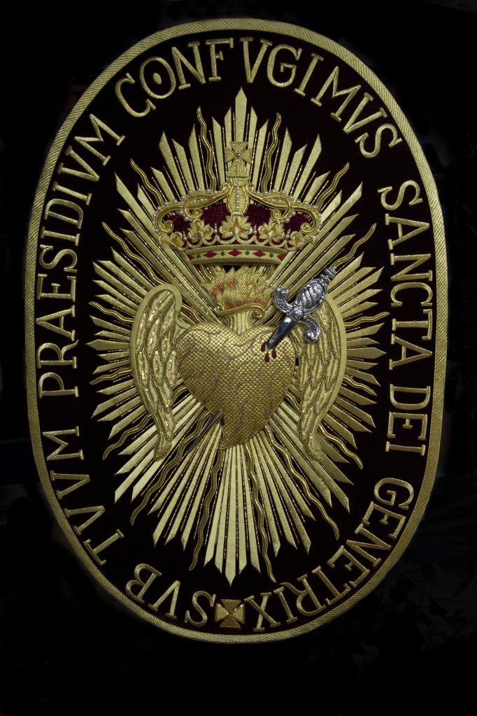 La gloria del techo de palio se contempla sobre terciopelo de la misma calidad y color del resto del techo. Un pequeño galón que la rodea servirá para realizar el corte y delimitarla. El motivo central es un corazón llameante alado y resplandeciente entre rayos, representando el amparo de la Stma. Virgen, simbología presente en el llamador del Paso, que nos parece la más representativa y parlante de la advocación de la Virgen. Ese corazón se encuentra traspasado por un puñal, vinculándolo con el carácter doloroso de la Imagen a la que alude, y rematado por corona real. Rodeándolo van los primeros versos del himno “Sub Tuum praesidium”, el más antiguo dedicado a la Virgen María, datado alrededor de los SS. III-IV de nuestra era, cuyo uso es contemplado por la liturgia romana como antífona mariana. La traducción al castellano de la secuencia incluida es la siguiente: “Bajo tu amparo nos acogemos, Santa madre de Dios”.