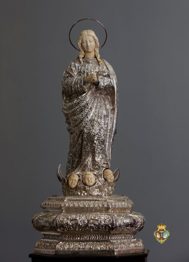 Ejecutada en plata de ley cincelada y repujada con carnaciones de marfil, se inspira en «La Cieguecita» de la Catedral que tallase Juan Martínez Montañés. Sostiene una nube con cabezas de ángeles alados sobre una peana octogonal con cuatro cartelas con las inscripciones: «TOTA PULCHRA / EST MARIA / ET MACULA / NON EST IN TE/». Ya en la base de la peana aparecen inscritas la fecha de ejecución y el donante de la pieza.