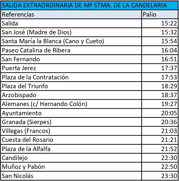 El itinerario será: Salida (15h), San José, Cano y Cueto, Jardines de Murillo, Paseo Catalina de Ribera, San Fernando, San Gregorio, plaza de la Contratación, Miguel de Mañara, plaza del Triunfo, plaza Virgen de los Reyes, Palacio Arzobispal (18.15h.), Alemanes, avenida de la Constitución, plaza Nueva, Ayuntamiento (19.45h), Granada, Entrecárceles, Álvarez Quintero, Cuesta del Rosario, Ángel María Camacho, Alfalfa, Águilas, Muñoz y Pabón y entrada (23.30h).