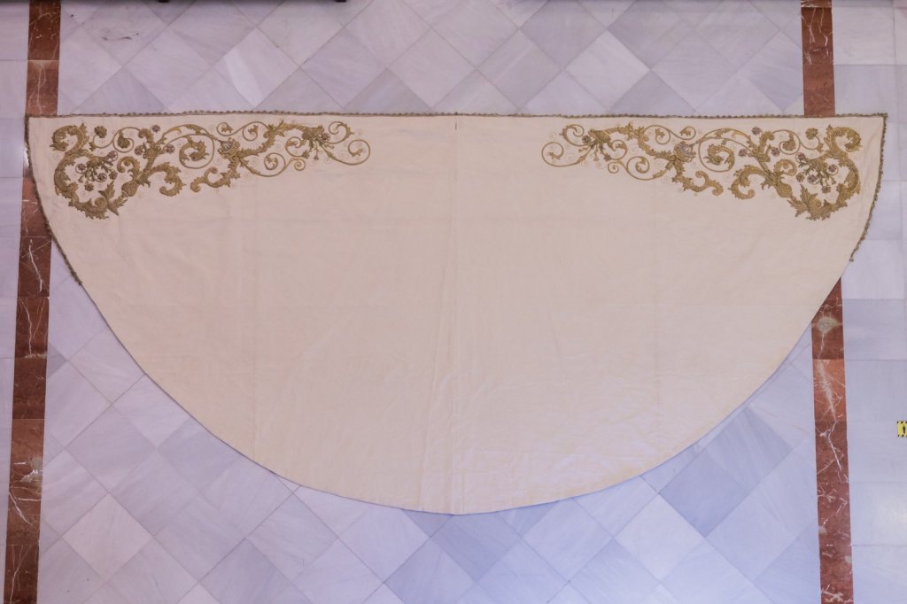 Esta pieza está bordada en oro sobre terciopelo blanco partiendo de unos bordados de faldones primitivos de Benjamín Pérez, pasado a tejido otomán blanco en 2009 y enriquecido con nuevos bordados por taller de Paleteiro.