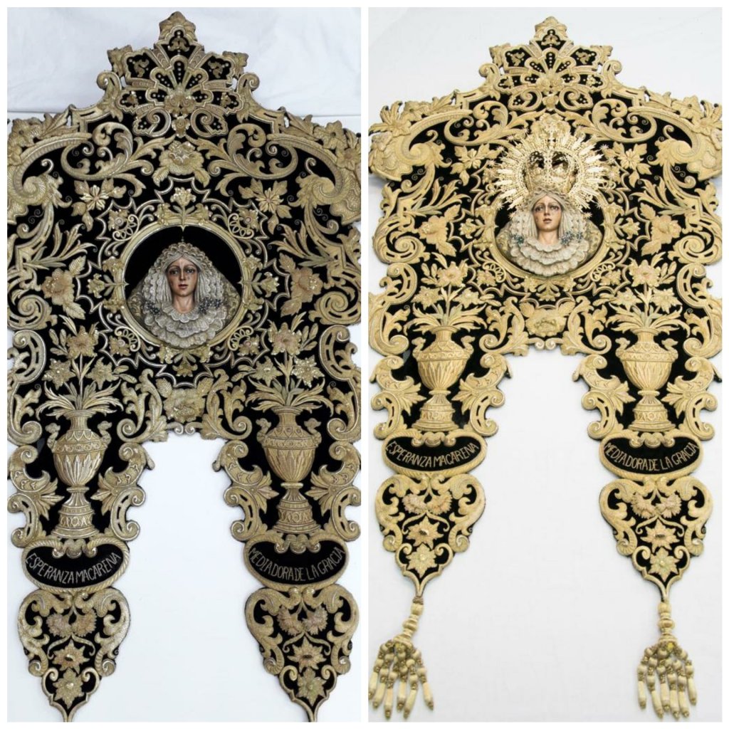 La obra fue realizada en oro fino sobre terciopelo verde por el Taller de Carrasquilla en el año 1989, llevando en el centro una miniatura de la Virgen de la Esperanza, obra de Luis Álvarez Duarte.