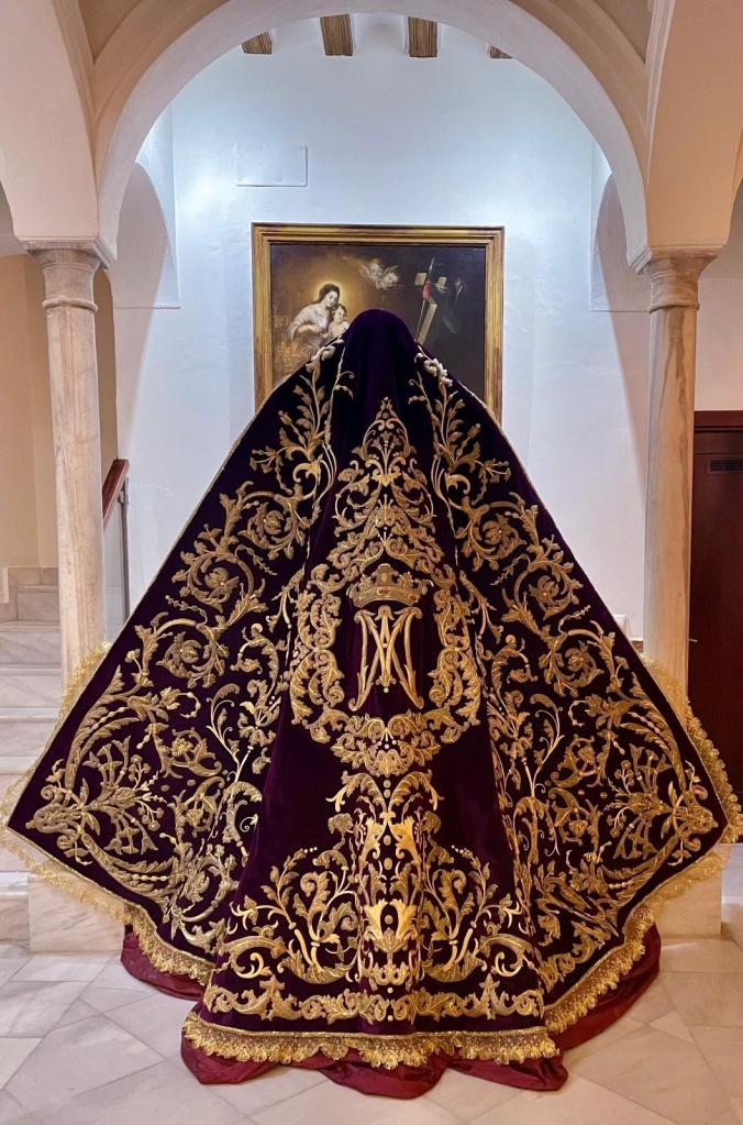 El manto se confeccionó en los talleres de Caro, incorporándole dicho taller, el anagrama del Ave María a modo de gran cartela. El manto, que se encontraba muy deteriorado, ha sido intervenido en el taller de Charo Bernardino, pasándolo a nuevo terciopelo morado y enriqueciéndolo bajo diseño de Francisco Javier Sánchez de los Reyes.
