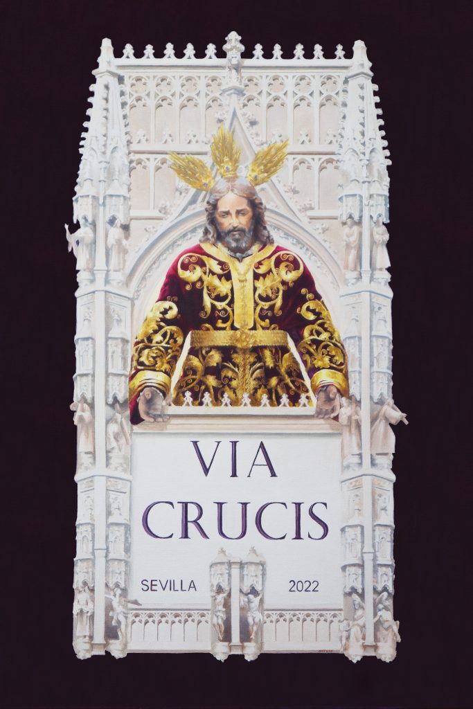 En la obra se representa una vista frontal de Nuestro Padre Jesús del Soberano Poder en su Prendimiento, de medio cuerpo, ataviado con túnica bordada, en el centro de la decoración la “Puerta de Palos” (ligeramente versionada para encuadrar toda la representación), la cual abre paso a la celebración del acto del rezo del Vía Crucis 2022.