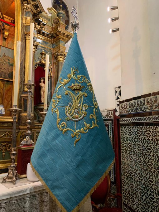 La Hermandad de la Virgen de la Cabeza ha presentado la nueva Bandera de la Inmaculada Concepción. Ejecutada en hilos de oro y plata por el Taller de Bordados Santa Clara, que regenta José Luis Sánchez, emplea un tejido de moaré celeste como soporte. El perímetro está rematado por un fleco de canutillo de oro entrefino