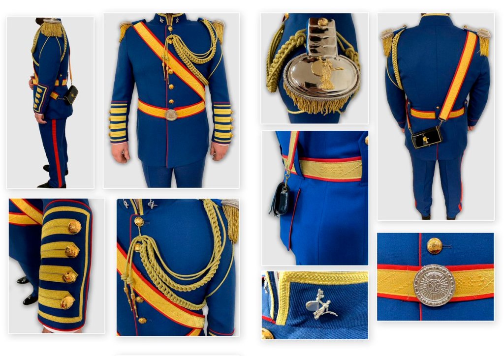 El nuevo uniforme es de tela tipo sarga azul cobalto. La chaqueta, cerrada al centro con siete botones dorados con el escudo constitucional estampado, cuenta con un cuello de trilla rematado con un galón de oro en el borde superior, recuperando los giraldillos en plata. En el cruce de la chaqueta lleva un detalle en rojo, al igual que en la abertura trasera y los bordes de las costuras. La gala es de corte simple. El cinturón y el cinto son dorados, compuestos de castillos y leones con ribetes en rojo. En los puños se aprecian cuatro sardinetas en galón oro, rematadas cada una con los mismos botones que cierran la chaqueta. Los puños de la chaqueta y los cuellos son blancos, simulando una camisa. Las hombreras son de alpaca plateada con retoques dorados con el giraldillo y canana de charol con bordados dorados.