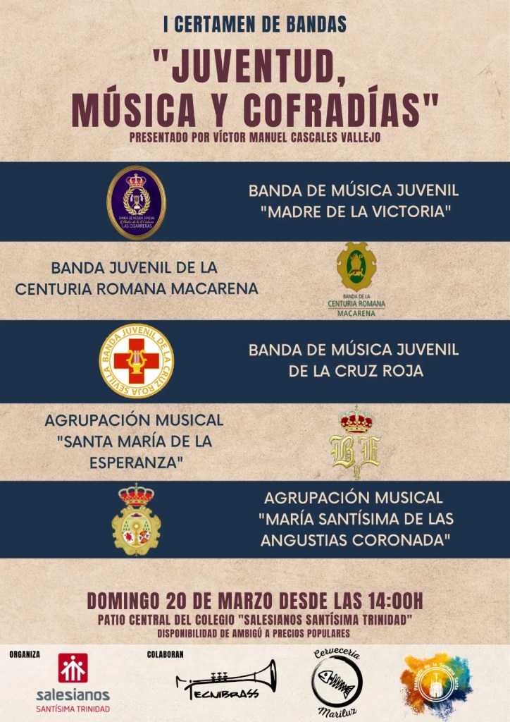 La Casa Salesiana de la Trinidad organiza el próximo 20 de marzo, el “I CERTAMEN DE BANDAS: JUVENTUD, MÚSICA Y COFRADÍAS”, que tendrá lugar en el patio central de María Auxiliadora del colegio. Desde las 14:00h, tras la Eucaristía de 13:00h en la Basílica de María Auxiliadora.