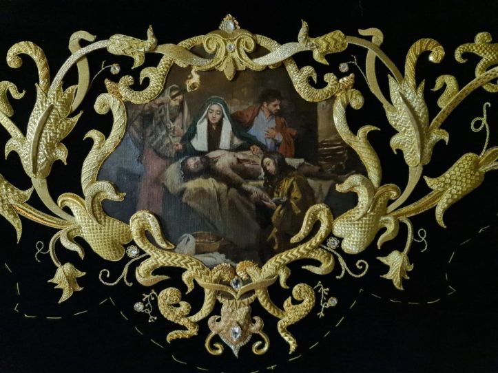 En el apartado de «Exvotos, símbolos de promesas cumplidas», en el hall de entrada, podemos ver obras llamativas de colecciones particulares: réplica de los flecos de bellotas del palio de Nuestra Señora de la Merced de la Hermandad de Pasión de Sevilla, de Sergio Guzmán Pasamanería Cofrade; Cíngulo de Nuestra Señora de la Soledad de Alcalá del Río (Sevilla), de Bordados Charo Bernardino; Frente del paso procesional de Santa Catalina Virgen y Mártir de El Granado (Huelva), de Artesanía del Dorado Hermanos González; custodia procesional en proceso, de Orfebrería Hijos de Luis Jiménez; Saya de Nuestra Señora del Robledo Coronada Patrona de Constantina (Sevilla), del taller de Paquili, Bordados en oro; peana procesional de María Auxiliadora de Triana, de Abel y Justi Doradores Restauradores; sombrero de plata de la Divina Pastora de Cantillana (Sevilla), de Alfonso Aguilar – Encajes de Sevilla, túnica del Cristo de la Salud de los Gitanos de Sevilla, de Sucesores de Elena Caro; túnica de los Devotos de Nuestro Padre Jesús del Gran Poder de Sevilla, de Bordados Santa Bárbara; forro de la Túnica de los Devotos de Nuestro Padre Jesús del Gran Poder de Sevilla; cordón del Simpecado de los Devotos de la Hermandad de Ntra. Sra. de la Asunción de Cantillana (Sevilla), de Cordonería Alba; ajuar de orfebrería de Ntra. Sra. del Rosario Los Humeros de Sevilla, de los Hermanos Delgado; saya de Ntra. Sra. del Socorro de la Hermandad del Amor de Sevilla, del taller de bordado en oro de José Antonio Grande de León; frente de la canastilla y candelabros del paso de Ntra. Sra. de la Estrella de El Garrobo (Sevilla); estandarte Sacramental de Benamejí (Málaga), de Bordados Santa Clara.
