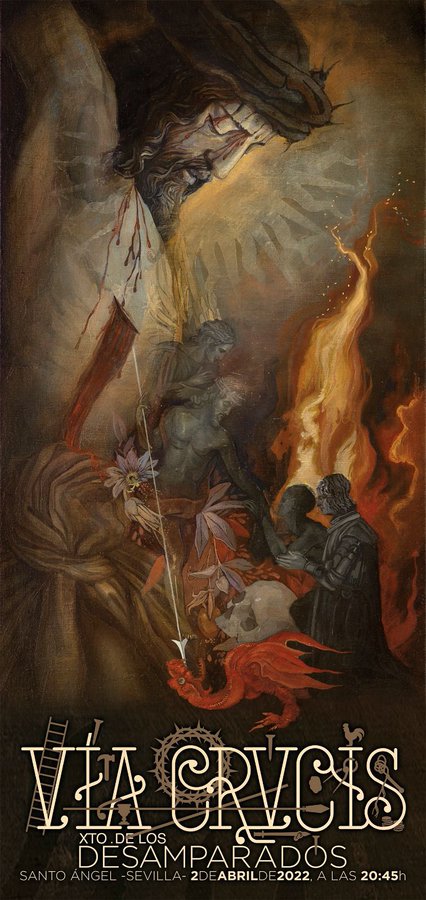 – Jesús Zurita ha realizado el cartel del vía crucis del Cristo de los Desamparados del Santo Ángel del 2 de abril. De la herida del costado brotan frutos de la pasión, flores y es símbolo de la ruptura de las cadenas de la muerte para abrir las puertas a la vida eterna. Representa el pasaje del descenso de Cristo a los infiernos y la relación de este suceso con el carisma carmelita. Asegura el autor que la muerte de Cristo y la soledad la hayamos al caminar junto a Él por la calle de la amargura cada Semana Santa, viendo en su muerte la nuestra. Es un cartel lleno de esperanza, de mensaje de que en medio de una sociedad en guerra, la vida es el bien más preciado que Dios nos brindó.