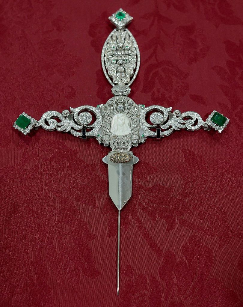 El puñal, que resulta totalmente desmontable para poder usar todas sus piezas por separado, alberga en su centro la medalla de estilo art decó donde se representa en relieve una imagen de la Virgen labrada en nácar, rodeada de profusa decoración a base de brillantes.