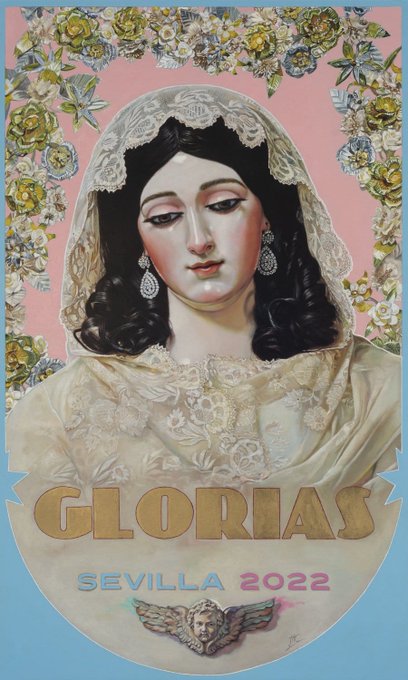 El salón de actos de la Cámara de Comercio de Sevilla ha acogido este jueves la presentación del Cartel de las Glorias 2022, obra de José Cabrera Lasso de la Vega. Dedicado a la Virgen de las Nieves, está realizado sobre tabla previamente tratada y con técnica mixta (óleo y acrílico). Desde que recibió la llamada, tenía claro que pintaría a la Virgen de las Nieves de Santa María la Blanca, así lo pensó mientras la vio procesionar el pasado otoño.