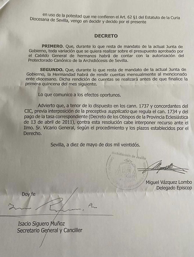 El Arzobispado ha emitido un decreto por el cual obliga a la Junta de Gobierno de la Hermandad del Valle, hasta que finalice su mandato, a presentar las cuentas mensualmente y a solicitar autorización para cualquier modificación presupuestaria.