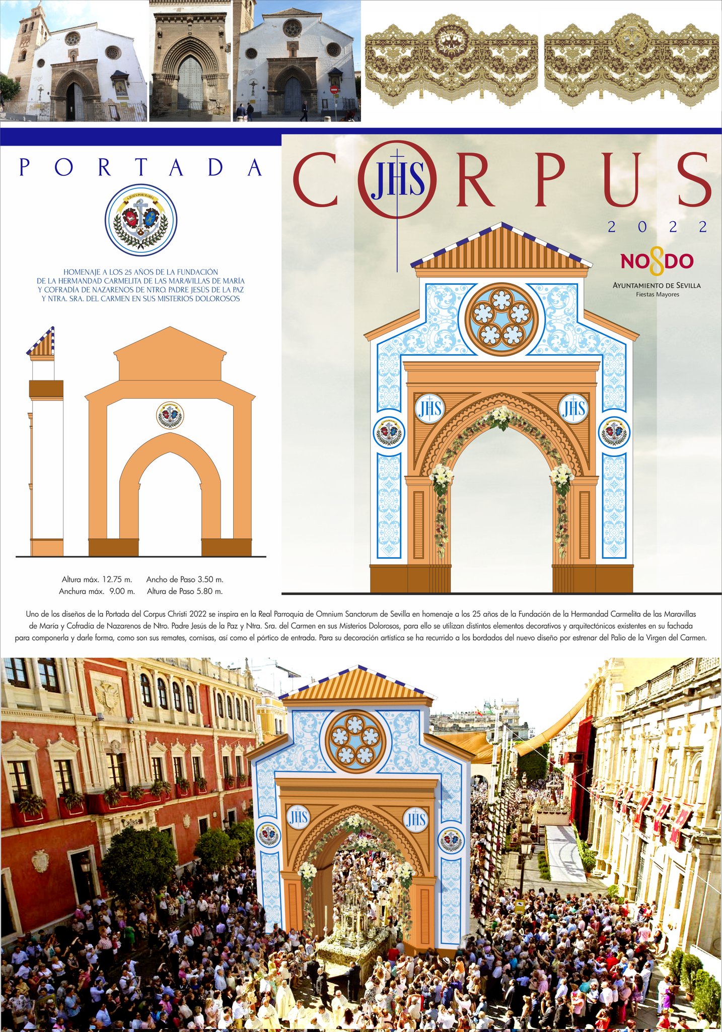 Esta mañana han sido presentadas en el Salón Colón del Ayuntamiento de Sevilla las portadas del Corpus Christi de este año, inspiradas en las fachadas de los templos de Omnium Sanctorum y de Santa Genoveva, sedes de las Hermandades del Carmen y de Santa Genoveva.