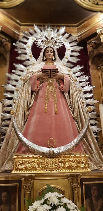 Durante el tiempo Pascual hemos visto a la Virgen de la O Gloriosa ataviada con un nuevo vestido realizado en terciopelo liso y tonalidad rosada por el taller de costura de la Hermandad de la O.