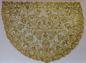 Se ha tomado como referencia la estructura de las mantillas valencianas de corte redondo que llevan una cenefa perimetral y un motivo central de gran desarrollo. Se inspiran los ornamentos en la decoración del manto burdeos que realizase en 1965 los talleres de Esperanza Elena Caro a partir de los trajes de luces y capote de paseo de los toreros Antonio Ordoñez y el Algabeño.