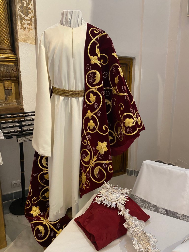 La Hermandad de la Cena ha recibido un nuevo mantolín bordado en oro sobre terciopelo rojo por Mariano Martín Santoja y donado por un hermano. Esta pieza será estrenada por el Señor de la Sagrada Cena en el traslado del Misterio al altar ubicado en el Palacio Arzobispal el día del Corpus Christi.