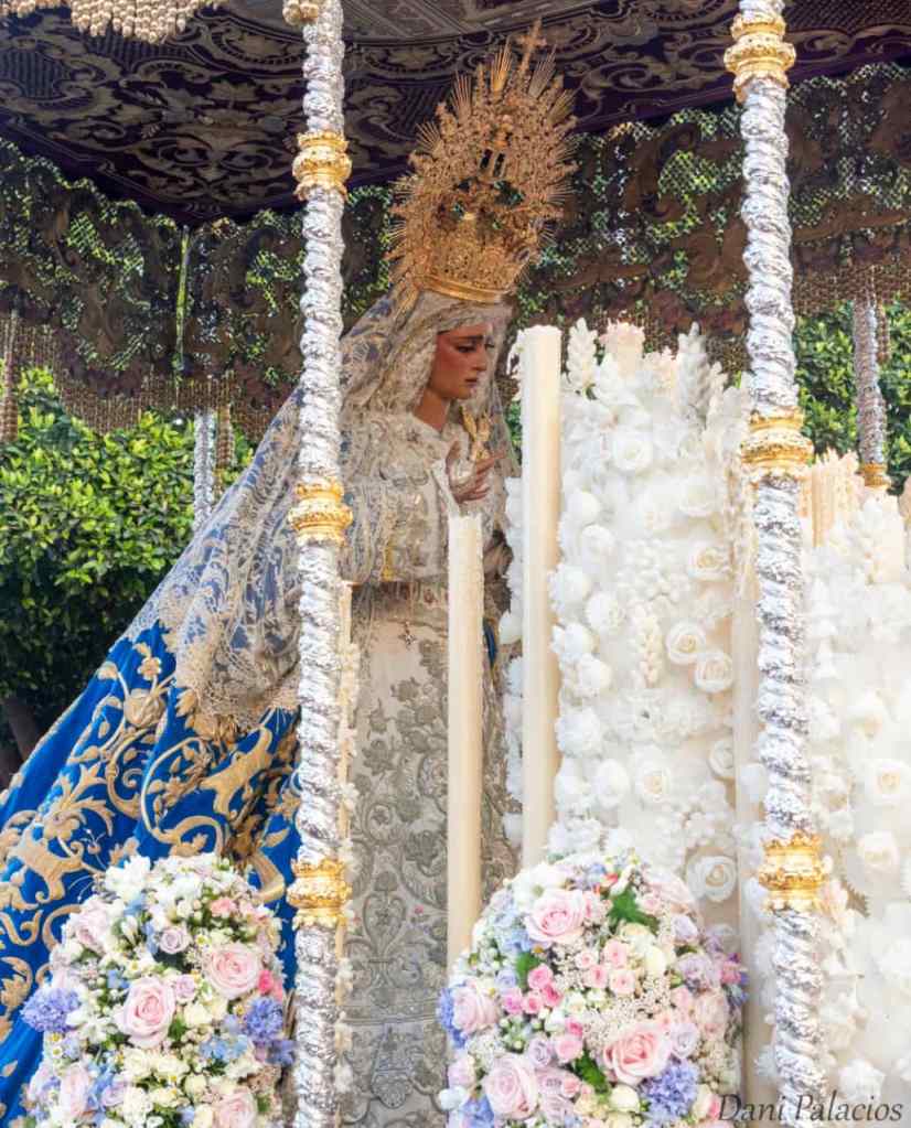 A una obra de arte efímera: al aspecto del palio de la Virgen de las Angustias de la Hermandad de los Gitanos por el conjunto compuesto por la mantilla de las palmeras, la saya de Gitanillo de Triana y el manto azul pavo de Carrasquilla y el exorno floral.