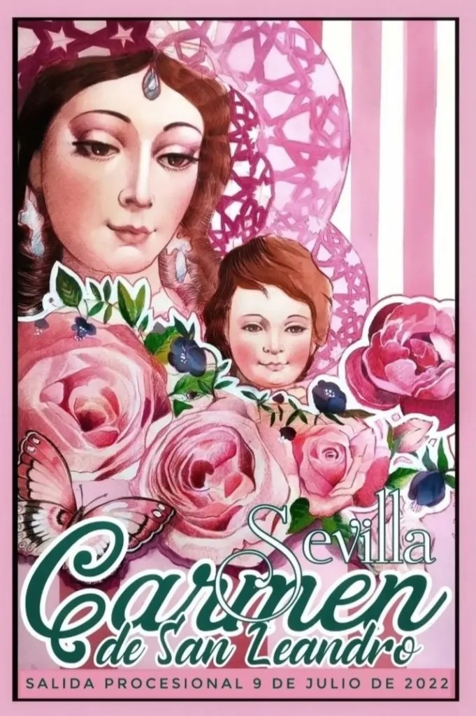 La Hermandad del Carmen de San Leandro ha presentado su cartel de la procesión de la Santísima Virgen, obra del artista Francisco Rovira Yagüe del taller de Daroal, que se inspira en la cartelería francesa de perfumería a finales del siglo XIX y principios del XX.