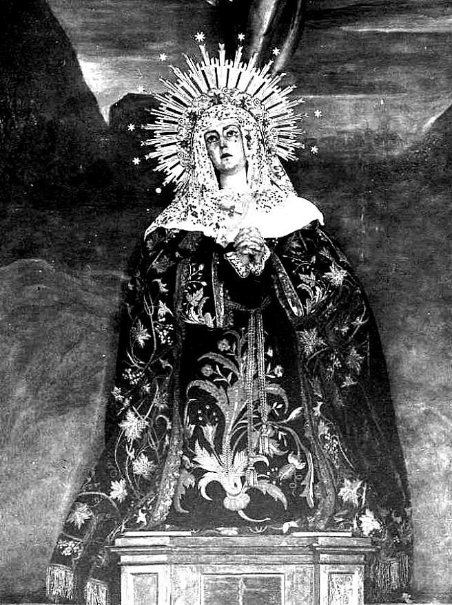 Obra del escultor Cristóbal Ramos (1772), imagen de candelero que fue concebida para ir arrodillada delante del Cristo con las manos entrelazadas, con la posición conocida como el Stabat Mater, formando así parte del único paso que poseía la hermandad; según Bermejo y Carballo en su obra Glorias Religiosas de Sevilla, …»una de las buenas de esta ciudad; ostentándose la Señora arrodillada, con las manos cruzadas sobre el pecho, y los ojos fijos en el cielo, en una actitud expresiva y devota«.