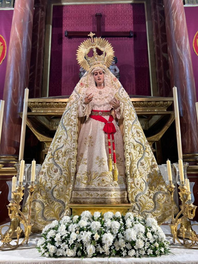 La Virgen de Villaviciosa de la Hermandad del Santo Entierro ha amanecido hoy en el altar mayor de San Gregorio para su Función Solemne de esta tarde. Como principal novedad, luce el manto de la coronación de la Virgen de la Salud cedido por la Hermandad de San Gonzalo, al igual que hizo hace unos meses la Virgen de la Aurora de la Hermandad de la Sagrada Resurrección.