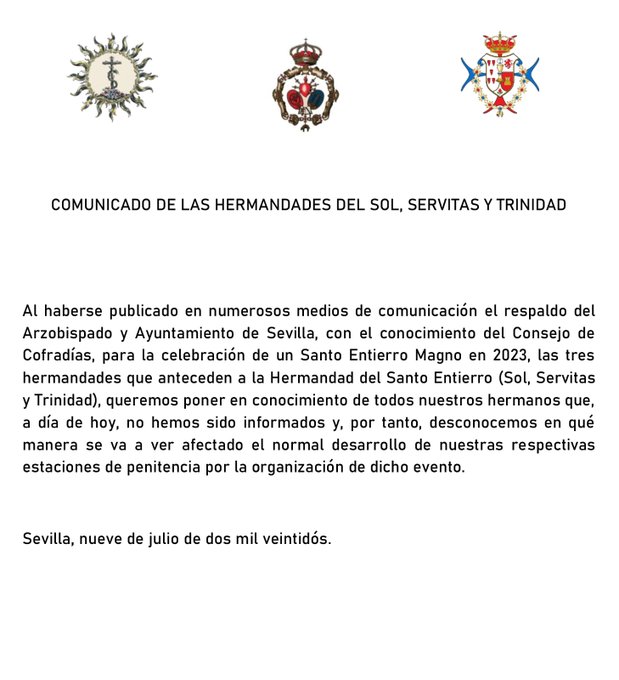Las hermandades del Sol, los Servitas y la Trinidad, las tres primeras del Sábado Santo, han emitido un comunicado conjunto en el que informan a sus hermanos que no han sido informados de la celebración del Santo Entierro Grande en 2023, y por ende, desconocen si se verán alteradas sus estaciones de penitencia.