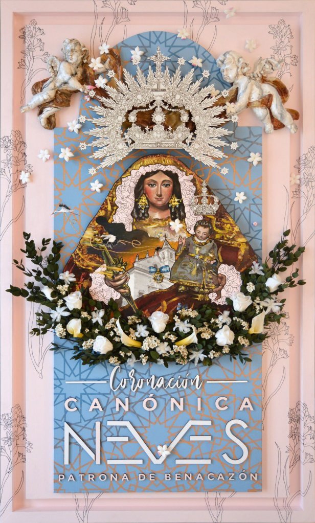 El pasado lunes la parroquia de Benacazón acogió la presentación del cartel anunciador de la coronación canónica de la Virgen de las Nieves. Una obra realizada en técnica mixta sobre tabla realizada por Rafael Laureano. Según ha explicado el propio autor, en el fondo y exterior de la obra aparece un tapiz rosa estampado de nardos realizados con ligeras líneas negras, simulando el abrazo de una Madre.