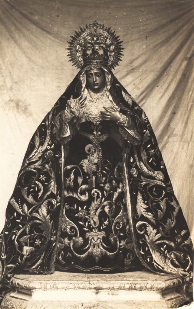 Los bordados reproducen el manto diseñado por Joaquín Díaz, en 1890, que la Virgen llevaba en el incendio ocurrido en el paso de palio en la Plaza de San Francisco, en 1893, y que hoy en día posee la Virgen del Pasmo, de Bollullos Par del Condado.