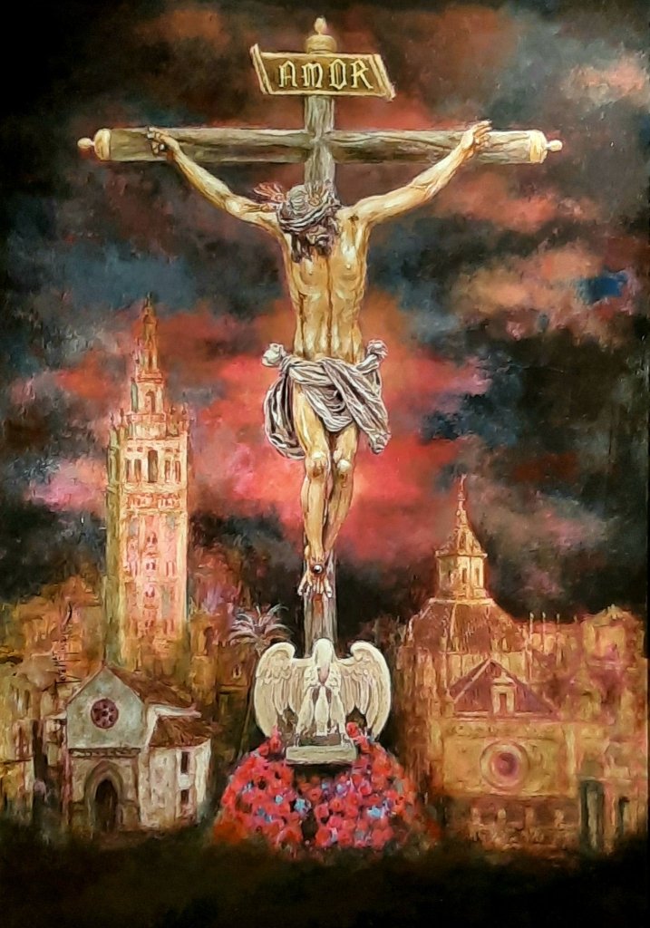 En el cartel aparece el Santísimo Cristo del Amor en el centro, estando a sus pies la imagen del pelícano y la palabra AMOR en el INRI. Tras Él se encuentra a la izquierda la Giralda y la Iglesia de Santa Catalina, y a la derecha la Iglesia del Divino Salvador.